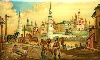 Painted in yellow-brownish palette this scene opens up a grandiose panorama before the viewer's eyes. It helps to imagine how ancient Moscow looked like, and observe everyday life of people who lived then. White-stone cathedrals and splendid palaces rise behind the strong fortifications, the burnished gold onion domes glisten on the sun, and the townspeople are occupied with their daily routine: some of them carry vegetables to the market, the others pasture goats and sell their goods; while the nobility stroll along the river embankment. The overall detail in this scene is simply incredible!