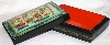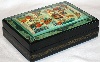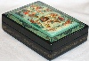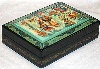 The box is constructed from paper-mache. Black lacquer is used to paint the exterior of the box while red lacquer completes the interior of the work. The lid isn't hinged, and the box rests on a flat bottom. The work is signed with the artist's name, Mstera and the title (“Russian Winter”).