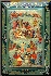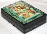 The palette is filled with cool, blue colors to reproduce an atmosphere of a cold winter day. The edges of the lid are decorated with intricate gold and silver patterns painted against the light green background. The box's sides are decorated with gold leafy ornaments.