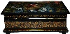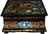 The box is made out of paper-mache. Black lacquer covers the exterior and red lacquer covers the interior of the box. The box has a hinge above the composition, and rests on four legs. The work is signed with the name of the artist, the village of Mstera and the title.