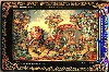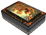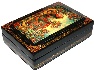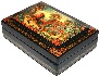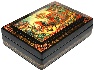 Description: The talented Mstera artist Alexander Dogadin painted this box showing an episode from the Pushkin's novel "Dubrovsky" written in 1841. Vladimir Dubrovsky is a Russian Robin Hood - an impoverished nobleman became a highwayman to take his revenge on the rich and protect the poor. His father's property has been confiscated by a corrupt and malicious landowner Troekurov. After his father dies, and his faithful servants burn his ancestral house to the ground, Dubrovsky turns to crime. He organizes a band and robs only rich dishonest people. To take revenge on Troekurov for his father's death, he masquerades as a French tutor, and enters the Troekurov's house. From this moment the plot develops as a romantic story. Troekurov's daughter, Masha, falls in love with the French Tutor of her brother, and Dubrovsky also loves the girl. He confesses that he isn't a teacher; he is Dubrovsky, but now he doesn't want to take revenge on her father, because he loves her. Meanwhile Troekurov finds out who is the French Tutor, and Dubrovsky must leave his house. During his absence a rich nobleman proposes marriage to Masha, and Troekurov forces his daughter to marry him. On her back way from the church where she got married with the rich nobleman, Dubrovsky stops the carriage and implores Masha to escape with him, but she answers that it's too late, as she has been married in the church (this scene is depicted here). After this event Dubrovsky disappears.