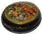 Description: This small, attractive box is a creation of Olga Strunina from the village of Mstera. In the center of the box's lid the artist has painted the basket filled with fresh ripe strawberries and encompassed this image with beautiful flowers, bees and butterflies. The composition is painted in soft tempera paints against the olive background. Each minute detail is richly enhanced in brilliant gold paint. The composition is framed with a simple gold pattern while the edges of the lid are adorned with more complex floral design also painted in gold.