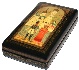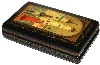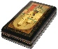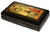 The scene is nicely drawn in calm, subdued tones of tempera paints. Gold paint is used to decorate the lady's dress and also to paint bells and cupolas of the cathedrals. Gold is also used to decorate the box's exterior with intricate patterns.