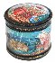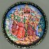 Here we can see Gvidon's island with all its wonders: the squirrel that all day long shells golden nuts, separating gold nutshells from emerald kernel of nuts, the thirty-three knights with their uncle old Chernomor, rising from the raging sea, and, the beautiful Princess Swan. On the lid of the box the artist depicts reunion of the family.