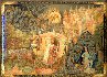 The work is painted in yellow and blue tones of tempera paints. Shining gold metal paint is used to fill composition with minute details, and also to create the golden background for some characters.