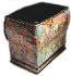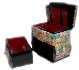 The box is constructed from paper-mache. Black lacquer is used to paint the exterior of the piece while red lacquer completes the interior of the box. The box has one large lid and 3 other compartments over it, each of them has own lid with a hinge. There is a large drawer compartment in a base.