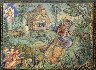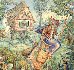 In this composition Baba-Yaga is flying from her Hut on the checken legs on a mortar with a broom in her hand. The painting is showing the dark forest, the Hut is located in the middle of the composition on the back stage. In the left lower corner, we can see a group of mushroomers, gathering mushrooms of a huge size! Up of this group there are two elks. In the uppper left corner we can see an image of Guardian Angel! In the upper right corner we can see one of the birds of Paradise- a Sirin, and lower it- a Bear.