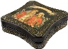 The box is constructed from paper-mache. Black lacquer is used to paint the exterior of the piece while red lacquer completes the interior of the work. The lid isn't hinged and the box rests on a flat bottom. On the bottom of the box the artist paints in gold the village of Palekh, her name and the date (2004).