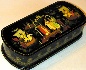 Description: This traditional Palekh box was painted by Anna Bokareva . It features a scene from the Pushkin's fairy-tale "The Tale of Tsar Saltan". In the center of the composition we can see Prince Gvidon standing arm-in-arm with his wife, Princess Swan, and Gvidon's father, Tsar Saltan. From the left and the right of this scene the people both Gvidon's and Tsar Saltan's kingdoms glorify the reunion of the family.