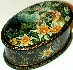 The scene is framed with a thin gold line; the edges of the lid are decorated with a foliage gold pattern. The same pattern wraps around the box's bottom border. The sides of the box are decorated with intricate gold patterns completed with the images of flowers and butterflies painted in bright tempera paints. This original decoration suits perfectly to the scene painted on the lid.
