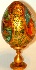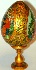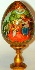 Description: This splendid Easter egg is a creation of the talented Natasha Kornilova from the village of Palekh. It features two scenes based on the biblical subjects. One of them shows the holy family: the Virgin Mary with her child; another one shows Jesus Christ blessing the maiden. The scenes are framed with the braid-like patterns. The exterior of the egg and the pedestal on which it rests are covered with lustrous gold metal paint, and decorated with vines painted in green and brown tempera paints. Vines have been painted purposely here as they have a definite religious meaning. Vine symbolizes the figure of Jesus Christ, while its branches and grapes symbolize the pupils of Jesus Christ.