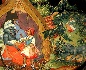 Various shades of green, brown, red and blue dominate here. Each element of the composition is richly detailed with gold and aluminum paints. Gold and aluminum paints are also used to create an intricate floral pattern that decorates the composition.
