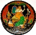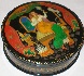 Description: This round box is a creation of Babkin from the village of Palekh. It features a fragment from the popular story of, "The Sleeping Princess." In the center of the scene we can see the evil Queen who asks her magic mirror who is now the most beautiful woman in the kingdom. The mirror answers that her stepdaughter is the most beautiful woman in the kingdom.