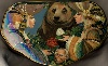 It shows the main characters from the fairy-tale "Snow White and Rose Red" written by the brothers Grimm. The tale tells the story of Snow White and Rose Red, two girls living with their mother in a small cottage. One winter evening, there is a knock at the door. Rose Red opens the door to find a bear. At first she is terrified, but the bear tells her not to be afraid. They let the bear in and he lies down in front of the fire. Snow White and Rose Red beat the snow off the bear, and quickly become quite friendly with him. They let the bear spend the night in front of the fire, and in the morning, he leaves, trotting out into the woods. The bear comes back every night for the rest of that winter and the family grows used to him. When summer comes, the bear tells them that he must go away for a while to guard his treasure from a wicked dwarf. During the summer the girls are walking through the forest, when they find a dwarf who has his beard stuck in a tree. The girls rescue him by cutting his beard free, but the dwarf is ungrateful, and yells at the girls for cutting his beautiful beard. The girls encounter the dwarf several times that summer, rescue him from some peril, and each time the dwarf is ungrateful. Then one day they meet the dwarf once again, who is as always trapped in some peril. This time he is terrified because the bear is about to kill him. The dwarf pleads with the bear, begs the beast to eat the girls instead of him, but the bear pays no heed and kills the dwarf with one swipe of his paw. Then the bear turns into a prince; the dwarf had bewitched the prince by stealing his gold and turning him into a bear, but the curse is broken with the death of the dwarf. Snow White marries the prince and Rose Red marries his brother.