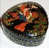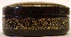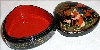 The box is constructed out of paper-mache. Black lacquer covers the exterior and red lacquer covers the interior of the piece. The exterior is decorated with intricate and precise, gold ornaments. The box has no hinge and rests on three legs. The box is signed with the artist's name, Palekh, the title and the year of 2005.