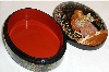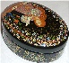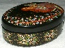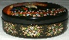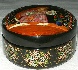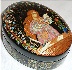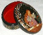 The box is made out of paper-mache. Black lacquer is used to cover the exterior and red lacquer to cover the interior of the box. The box has no hinge and rests on a flat bottom. The box is signed with the artist's name, Palekh and the year of 2003.