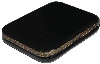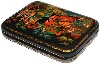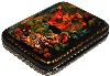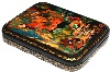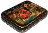The box is made of paper-mache. Black lacquer is used to paint the exterior of the piece while red lacquer completes the interior of the box. The lid is hinged from the top of the composition. Gold scrollwork frames the composition with an intricately managed design. A more intricate ornamentation pattern wraps around the sides of the box with aluminum accents within the floral pattern. It is signed with the artist's name, village and year (2009).
