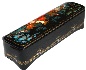 The box is constructed out of paper-mache. Black lacquer is used to paint the exterior and red lacquer is used to paint the interior of the box. The box has a shape of a glass holder. The box has a hinge located above the composition and rests on four legs. An artist has wrote Palekh, the year of 2006 and his name at the bottom of the composition in gold paint.