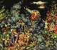 With masterful use of pallet and stroke, Kornilova has created action and motion in her work. The positioning and detailing of each character is beautifully executed with precision and lifelike blending. Gold and aluminum paint is used to carefully ornament the regal garb, to accentuate the mermaids' scales, and to finely highlight the entire scene.
