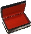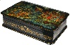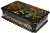 The box is constructed out of paper-mache. Black lacquer covers the exterior and red lacquer covers the interior of the box. The beveled lid and the base are ornamented with a string of gold dotted filigree. Around the box's midsection is an ornate gold and aluminum paisley leaf and flower decoration. The box has a hinge above the composition and rests on a flat bottom. Kornilova has signed the bottom right corner of her composition and dated (2000)the bottom left corner.
