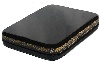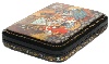 The box is constructed from paper-mache. Black lacquer is used to paint the exterior of the piece while red lacquer completes the interior of the box. The composition is framed with a simple pattern composed of silver and gold beads. The sides are decorated with more complex floral and foliage ornamentation painted in gold and aluminum. A hinge has been fastened to the top of the composition, and the box rests on a flat bottom. The work is signed with the artist's name, the title and the village of Palekh.