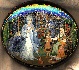 Cold blue tones of tempera paints are used to paint the left part of the composition that symbolizes the cold reign of the Snow Queen while calm browns, oranges and greens are used to reproduce the right part of the composition that symbolizes warm human feelings and warmth of a family hearth. Gold and silver detailing outlines, highlights, and provides light in every element of the composition. The use of metallic paint is executed with precision and with an unbelievably steady hand that is able to paint with razor like thinness.