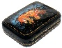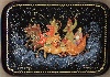 A loving couple traverses the snow-covered expanses of Russian countryside sitting in the sledge pulled at high speed by three mighty horses. The horses are painted in traditional orange, white, and red tempera paints that look so beautiful against the black background. Tiny silver dots are drawn throughout the scene to imitate swirling snowflakes. Gold paint is used to detail the sledge, the characters' costumes and the horses' harness.