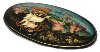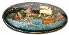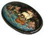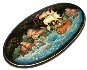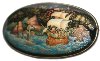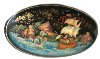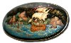 Description: Irina Peskova from the village of Palekh is the creator of this elegant oval brooch. It shows a meeting of the ship with a large snake in a water.