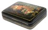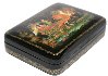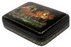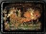 Description: Well-known Palekh Master and a teacher of Palekh Art school Vladimir Vlezko is the artist who painted this traditional scene. Here we see a couple racing through a field of summer flowers at a blistering pace while a driver encourages the horses. The pace that is being set by the driver looks like it will not be slowing any time soon.