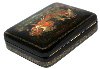 The box is constructed out of paper-mache. Black lacquer is used to paint the exterior and red lacquer is used to paint the interior of the box. The box has a hinge located above the composition and rests on a flat bottom. Vlezko has signed the box with his name, Palekh and the year of 2014 at the bottom of the composition in gold paint.