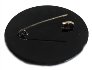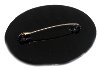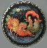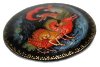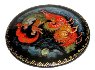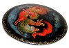 The brooch's edges are decorated with a golden ornament. The brooch is constructed from paper-mache. Black lacquer is used to paint the exterior of the box while red lacquer completes the interior of the work. The brooch has a pin to used on a cloth. The work is signed with the artist's name and the village of Palekh.