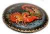 Description: Talented Palekh artist Kuzmenko Galina has painted this scene with a winter troika (three horse sleigh) speeding through the Russian countryside. A lonely lady hides from the frost in the sleigh while a driver encourages the horses.