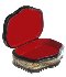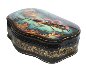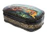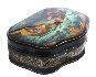 The box is constructed from paper-mache. Black lacquer is used to paint the exterior of the box while red lacquer completes the interior of the work. The lid is hinged to the top of the composition, and the box rests on wavy legs. The work is signed with the artist's name and the village of Palekh.