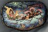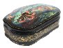 Description: This interesting composition painted by a talented Palekh artist Natalie Kornilova shows a dangerous trip that made by a young man. Snowstorm is in progress, but he must come St.Petersburg. We can see several hungry wolves following the troika (three horse sleigh) speeding through the Russian countryside. An image of Our Lord is painted over the troyka in the skies, like a guardian Angel. In the right upper corner we can see recognizible lines of city of St.Petersburg- Bronze Horseman and St.Peter and Paul Fortress.