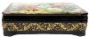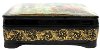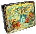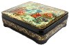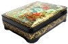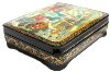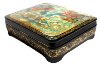 Description: This attractive box features several scenes from Hans Christian Andersen's fairy tale "The Snow Queen". It was painted by Natalie Varzina from the village of Palekh. In the right upper corner she depicts the evil dwarf who broke a magic mirror above the world that let out all of the ugliness, and those who were affected by it became wicked and noticed in everything only its bad sides. Poor Kay got a piece of this mirror stuck in his eye. Since then he fell under influence of Snow Queen. The left bottom corner shows Kay, Gerda, and their grandmother sitting in their cozy flat. At this moment the strong wind opens the window, and tiny pieces of magic glass penetrate into Kay's eye and heart. The right bottom corner depicts the Little Robber and her friends sitting in their den and cooking meal. They have just robbed Gerda's golden carriage, and intend to celebrate this lucky incident. In the right upper corner we can see the brave Gerda riding the reindeer and crossing the boundless expanses of the Lapland on her way to the Snow Queen's ice palace. In the center the Snow Queen allures Kay with her beautiful ice toys. The boy is enchanted with these toys; he forgot Gerda, his grandmother, and his former happy life. But Gerda is already here, in the Snow Queen's palace, she is ready to save him...