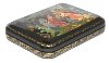 The box is made out of paper-mache. Black lacquer covers the exterior and red lacquer covers the interior of the box. The lid is hinged from the top of the composition and the box rests flat. Signed with the name of the artist, the year of 2011 and the village of Palekh.