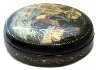 The box is made out of paper-mache. The interior of the box is red, while the exterior is covered with back lacquer. The lid is not hinged, and the box rests on a flat bottom.