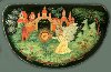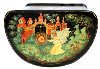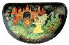 Description: This unique shape box was painted by a talented artist Galina Kuzmenko from Palekh. The box depicts the scenes from the popular Russian fairy-tale "The Scarlet Flower", written by Sergey Aksakov. The tale is very similar to what we know today as "Beauty and the Beast." This thrilling tale tells about love of a beautiful girl and a horrible beast that afterwards will turn into a handsome prince.