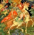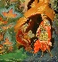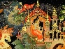 The artist fills the scene with lots of action and detail. The palette is quite diverse and he uses yellows, oranges, reds and cream tones to define the characters and the architecture, while dark greens and blues are used for the depiction of a surrounding landscape. He leaves the sky in the background blank, which is part of the traditional Palekh style. It makes one focus directly on the action, which is shown sometimes without regard for perspectives or proportions; this hearkens back to the icon painting style. The lines are all precisely drawn and the figures well decorated. Gold is used to enhance the detailing, as is aluminum in subtle amounts. The composition is filled with a life force that the artist creates with expert transitioning, brushwork, and overall flow of the action in the scene.