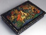The box is made of high-quality paper-mache. Black lacquer is used to paint the exterior of the piece while red lacquer completes the interior of the box. The lid is hinged from the top of the composition. Gold scrollwork frames the composition with an intricately managed design. A more intricate ornamentation pattern wraps around the sides of the box with aluminum accents within the floral pattern. It is signed with the artist's name, village and year (2003).