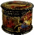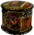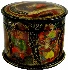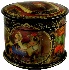 Description: This fine piece of Russian artistry was composed by the talented Inna Akimova from the village of Palekh. It is called "The house that Jack built", and shows the Russian version of the folk English song with the same title. This song was translated into Russian, and changed a little bit by the famous Soviet poet S. Marshak. The lid's composition and round painting on the sides shows various scenes from this verse. Each scene corresponds to a separate quatrain; and also each scene is entitled by the first line of each quatrain. The lid's composition features the main character of this verse, Jack, peeping out of his house. In the upper part of this scene we can see the title of this work written in gold paints. The sides of the box show as it was said above different quatrains from the verse that follow one after another: