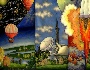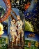 You can find here all the steps the human society made to come to cosmos. The history of examining cosmos begins with inventing balloons and planes that are depicted from the left and the right of the central scene in the bottom part of the composition. Then people invented cosmos stations and shuttles; they are depicted in the upper part of the composition. The central part features launching of the space rocket, two astronauts and the observatory. The rest part of the composition is dotted with bright gold stars and various planets.The composition is painted in bright tempera paints and richly detailed with gold and aluminum paints. The black background helps to reproduce infinite darkness of the space. Gold metal leaf shines through some the stars and the fire coming out of the space rocket.