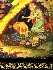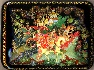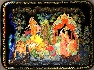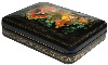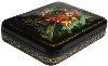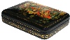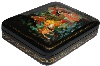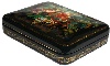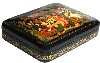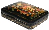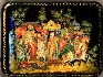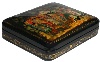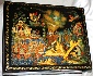 The composition painted on the lid of the large box shows some scenes from the introduction to the popular poem "Ruslan and Lyudmila". In the center of the box Vlezko has painted Alexander Pushkin, and all around his figure the artist has drawn various characters of his literary works. Here we can see the mermaid sitting on the old oak's branches, the hut on chicken legs where Baba-Yaga lives, Kashchey bending over his treasures, Ruslan fighting with Chernomor, the thirty three knights emerging from the raging sea, the learnt cat walking along the golden chain and telling fairy-tales, Baba-Yaga riding her mortar, and many other characters invented by Alexander Pushkin.