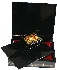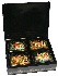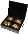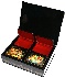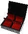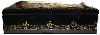 The exterior of this work is richly decorated. The edges of each box's lid are decorated with gold leafy patterns, while their sides are adorned with elegant gold leafy patterns accompanied by silver flowers. The large box as well as four boxes that it contains is hinged from the top of the composition; each box is covered with black lacquer while their interior is covered with red lacquer. The large box rests on a flat bottom while each of the boxes that it contains rests on four rounded legs.