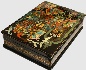 This elegantly shaped box is made out of paper-mache. Black lacquer covers the exterior and red lacquer covers the interior of the box. Gold ornamentation wraps around the sides of the box. The box has a hinge on the left the composition and rests on the four legs. The artist has written her name, the village name of Palekh, the title and the year of 2009 at the bottom of the composition.
