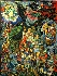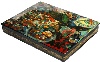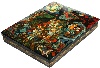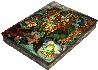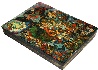 The artist's palette is diverse and holds a wide range of colors that she uses within this composition. She works in details with gold and aluminum paint that are fine and make the scenes radiate with a tremendous glow. Gold paint is also used to decorate the box's exterior with elaborate leafy patterns.