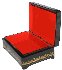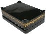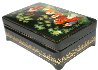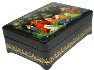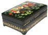 The box is made out of paper-mache. Black lacquer covers the exterior and red lacquer covers the interior of the box. Gold ornamentation frames the scene on the lid and wraps around the sides of the box. The patterns are floral based and seem as if they roll in endless succession one after the other. The box has a hinge from the top of the composition and rests on four legs. The work is signed with the artist's name, village, and the year (2013) at the bottom of the composition.