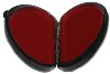 The box is made out of paper-mache. Black lacquer covers the exterior and red lacquer covers the interior of the piece. Gold ornamentation frames the compositions on the lids. The box has a hinge at the bottom of the compositions and rests flat.