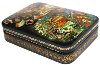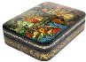 The box's lid is decorated with intricate gold patterns; the sides are decorated with silver and gold ornamentation.