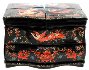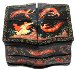 The box is constructed from paper-mache. Black lacquer is used to paint the exterior of the box while red lacquer completes the interior.